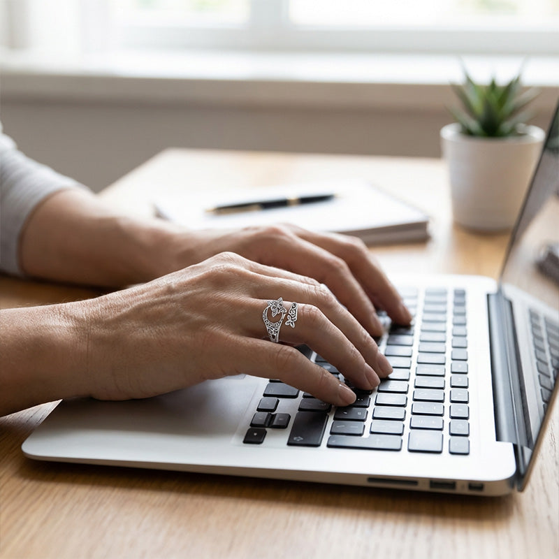 JUSTERBAR ĂPPEN DESIGN: Med sin praktiska öppna design kan ringen enkelt justeras för att passa de flesta fingerstorlekar perfekt. Detta garanterar en bekvĂ€m och sĂ€ker passform utan behov av exakt storleksmĂ€tning.