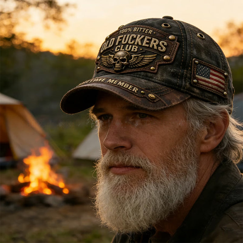 DÅDLIG VINTAGE-BRODERI - Visa upp din erfarenhet med patchar med texterna ”OLD FUCKERS CLUB”, ”100% BITTER” och ”LIFETIME MEMBER”. Denna keps Ă€r en hedersbeteckning som hyllar ett vĂ€l levt liv med en kompromisslös, robust stil.